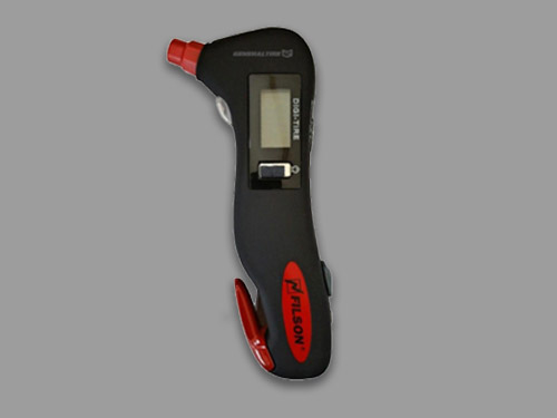 Digital Tyre pressure gauge with tool, LED flashlight, emergency hammer and warning lamp.