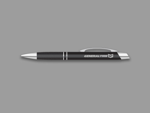 Metal ball point pen with blue refill and rubberized soft-touch surface.